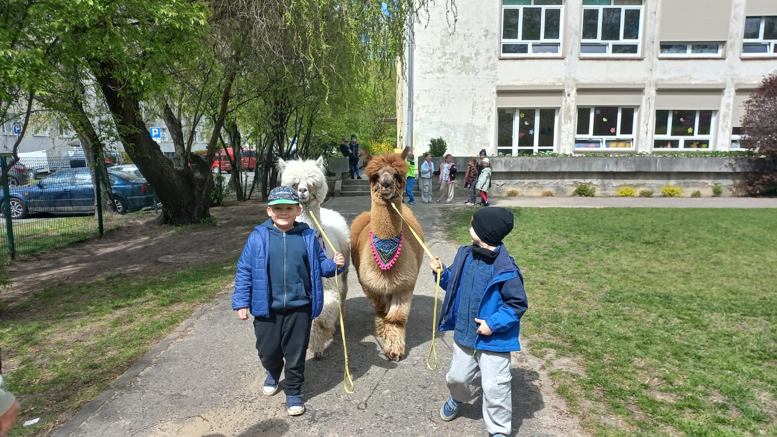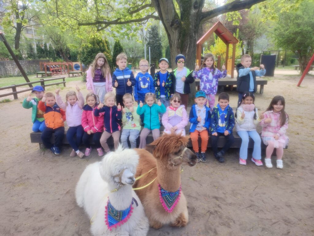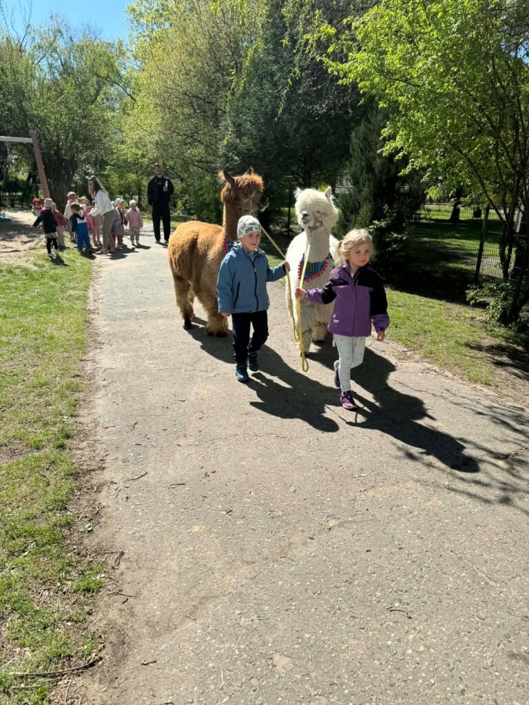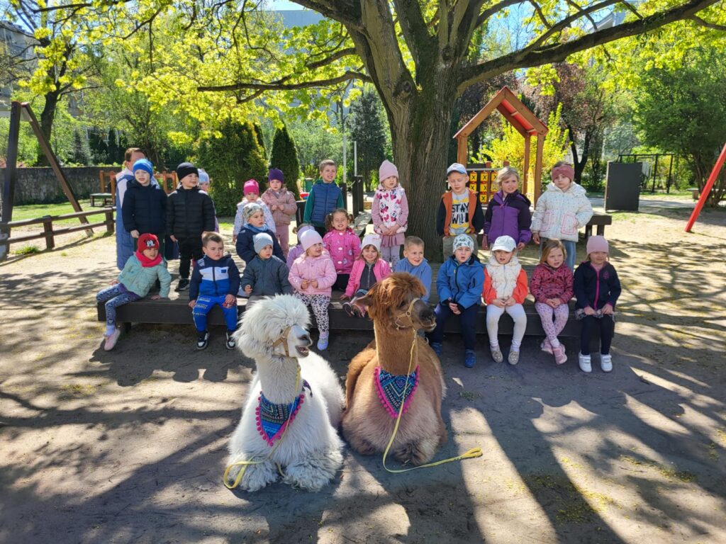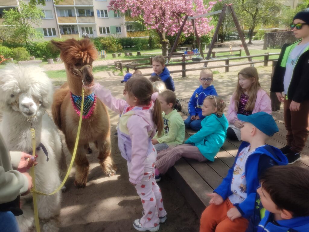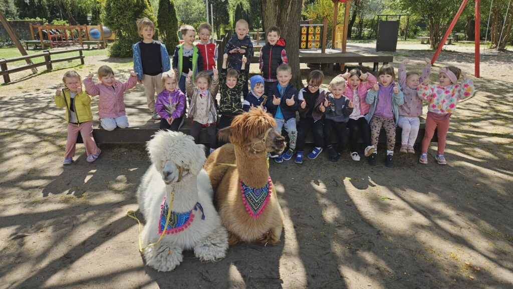 23 kwietnia nasze przedszkole odwiedziły alpaki, które wzbudziły ogromne zainteresowanie i radość dzieci. Przedszkolaki miały okazję je obserwować, głaskać, a także wybrać się na spacer z alpakami. Podczas spotkania dzieci poznały ciekawostki na ich temat. Spotkanie dostarczyło wszystkim wielu pozytywnych i niezapomnianych wrażeń.