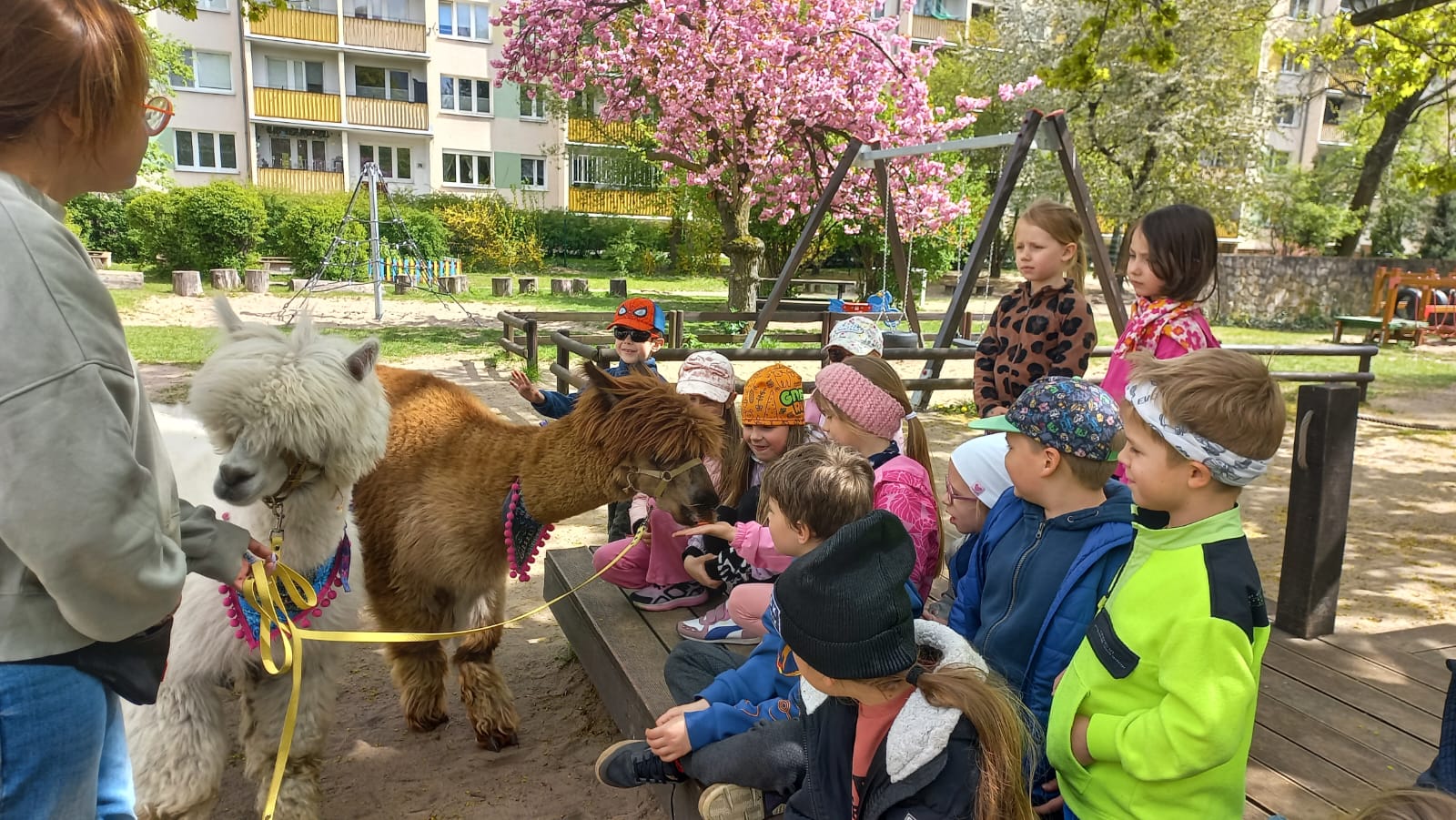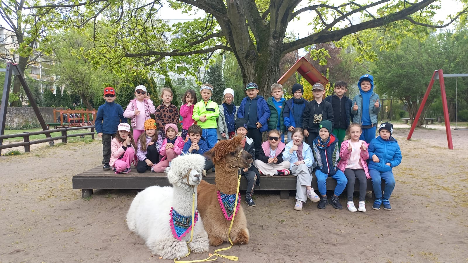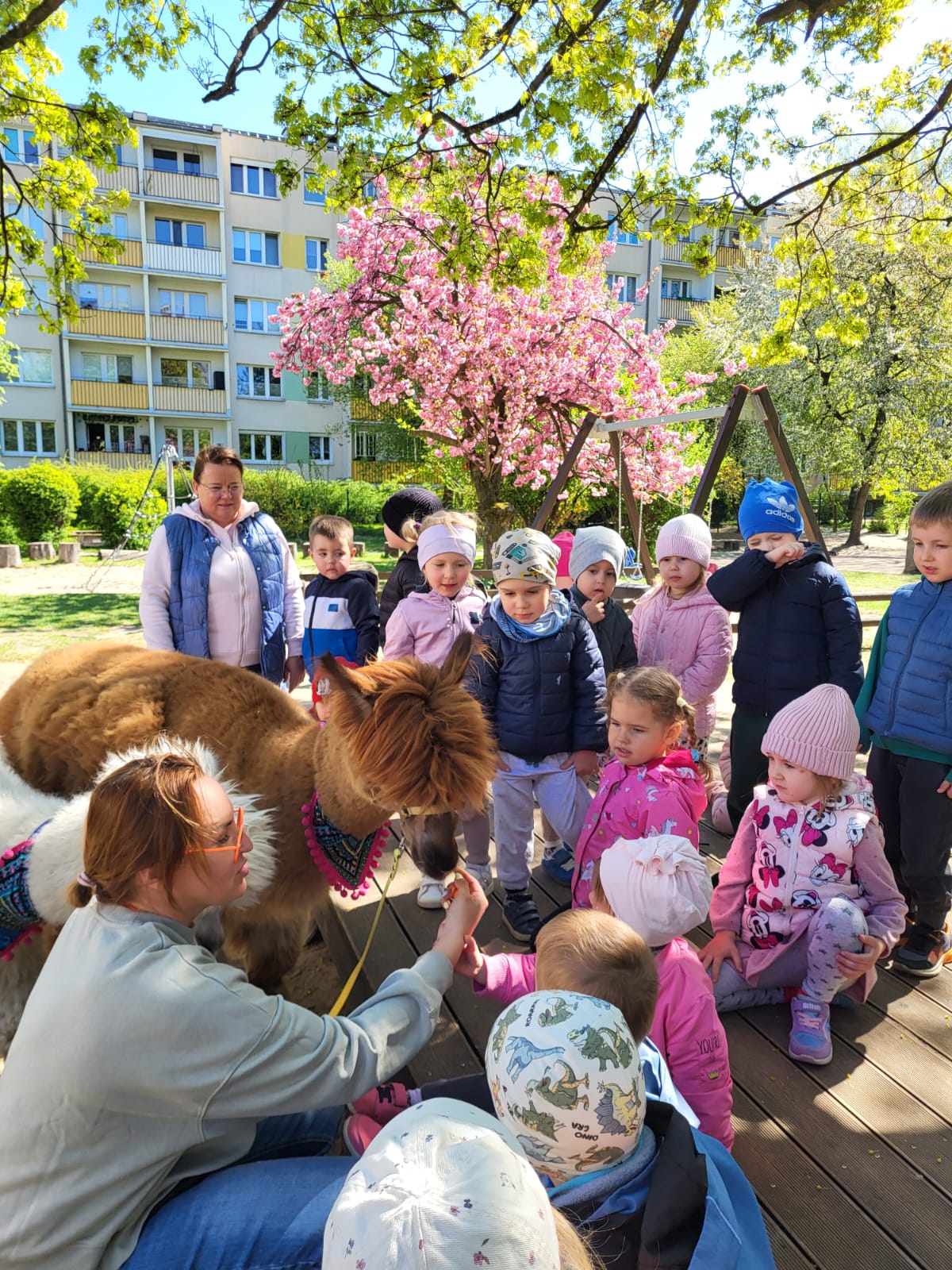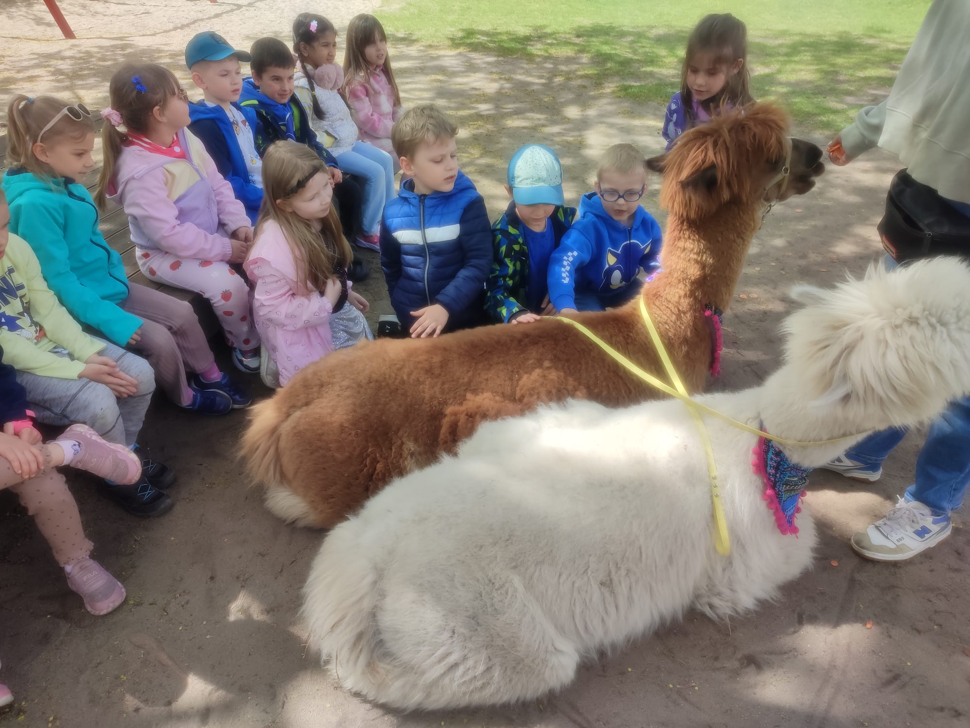 23 kwietnia nasze przedszkole odwiedziły alpaki, które wzbudziły ogromne zainteresowanie i radość dzieci. Przedszkolaki miały okazję je obserwować, głaskać, a także wybrać się na spacer z alpakami. Podczas spotkania dzieci poznały ciekawostki na ich temat. Spotkanie dostarczyło wszystkim wielu pozytywnych i niezapomnianych wrażeń.