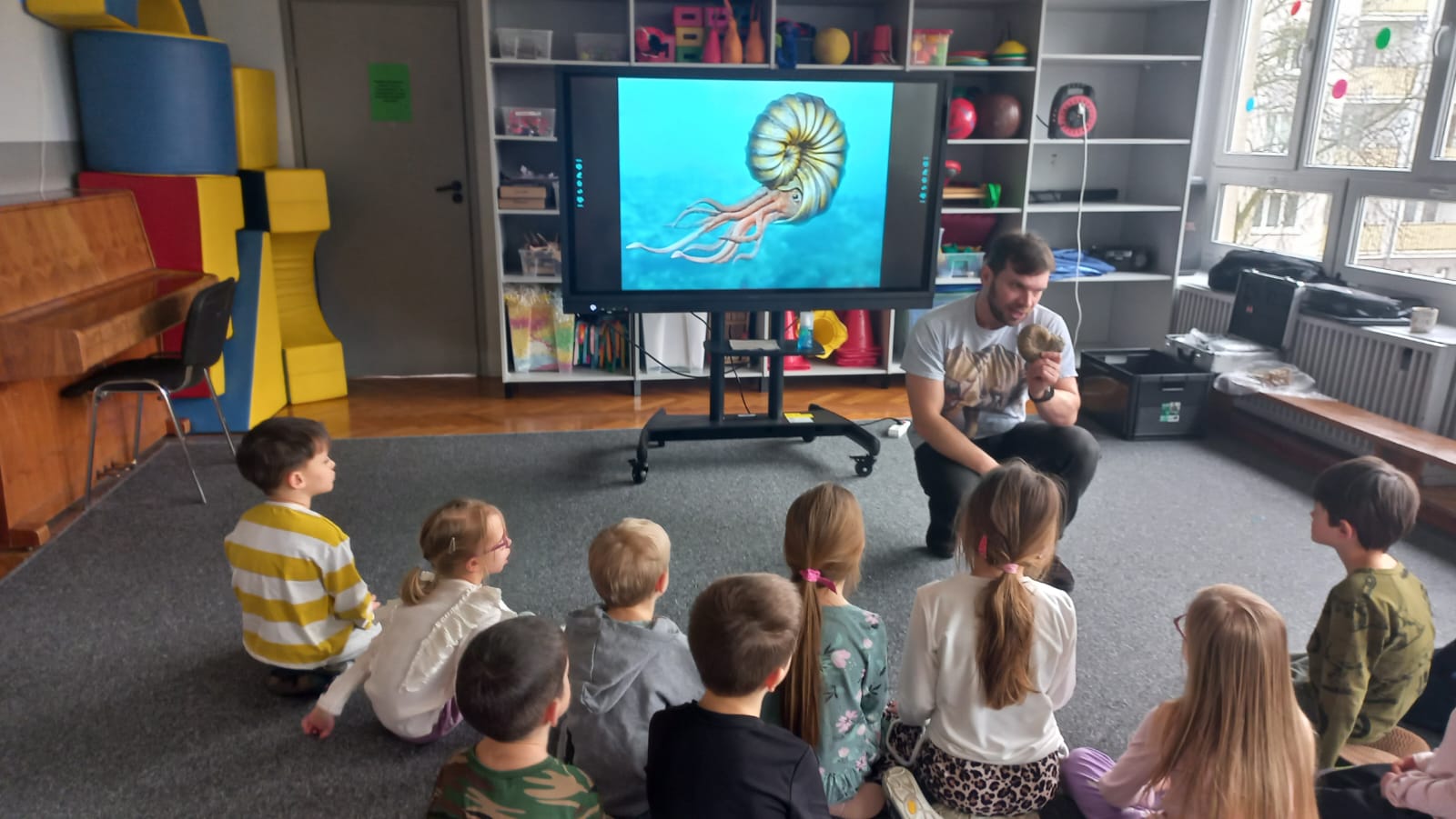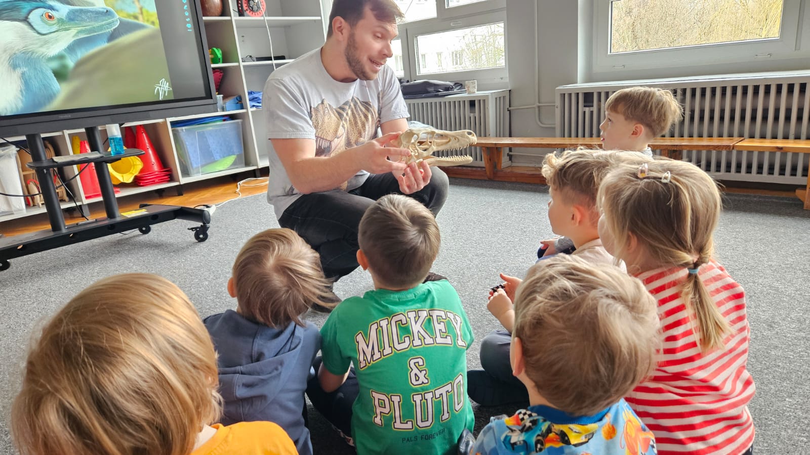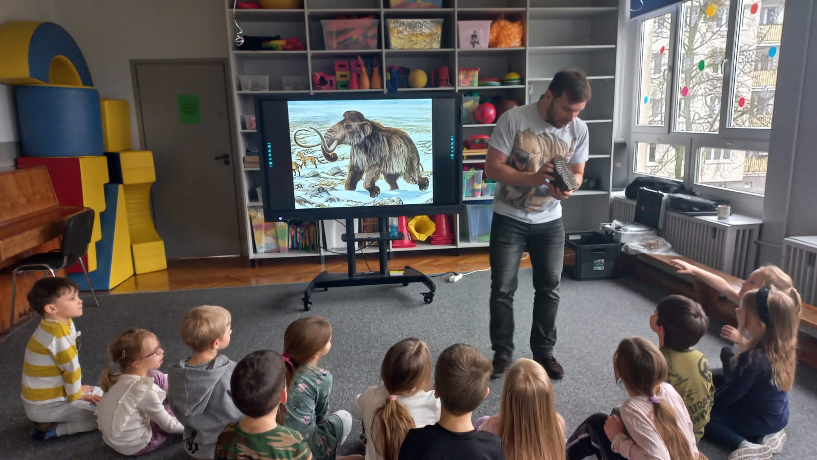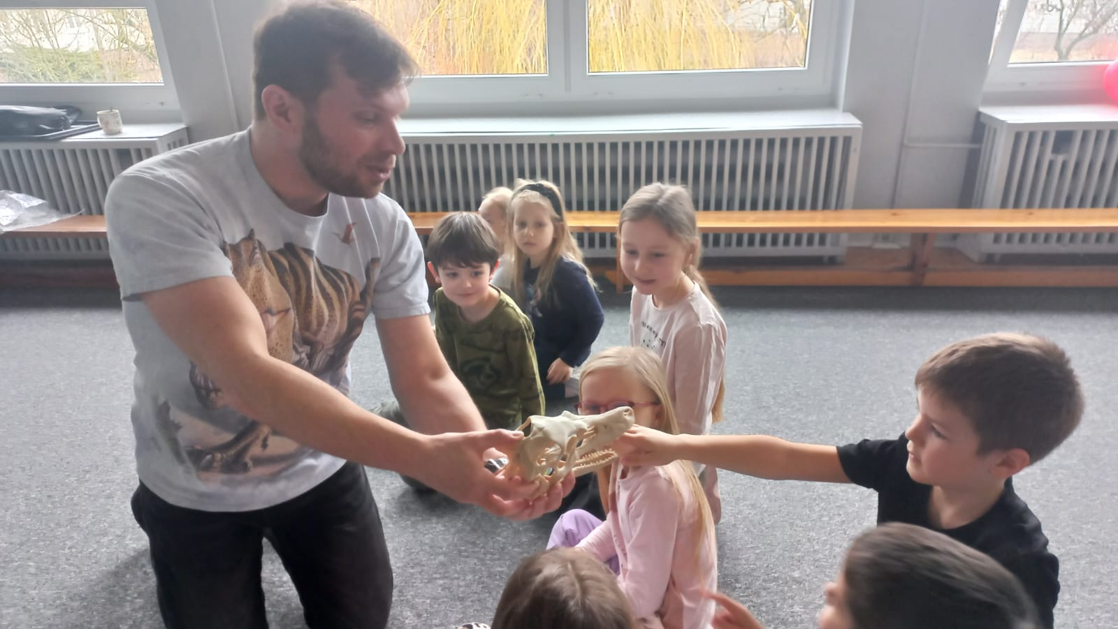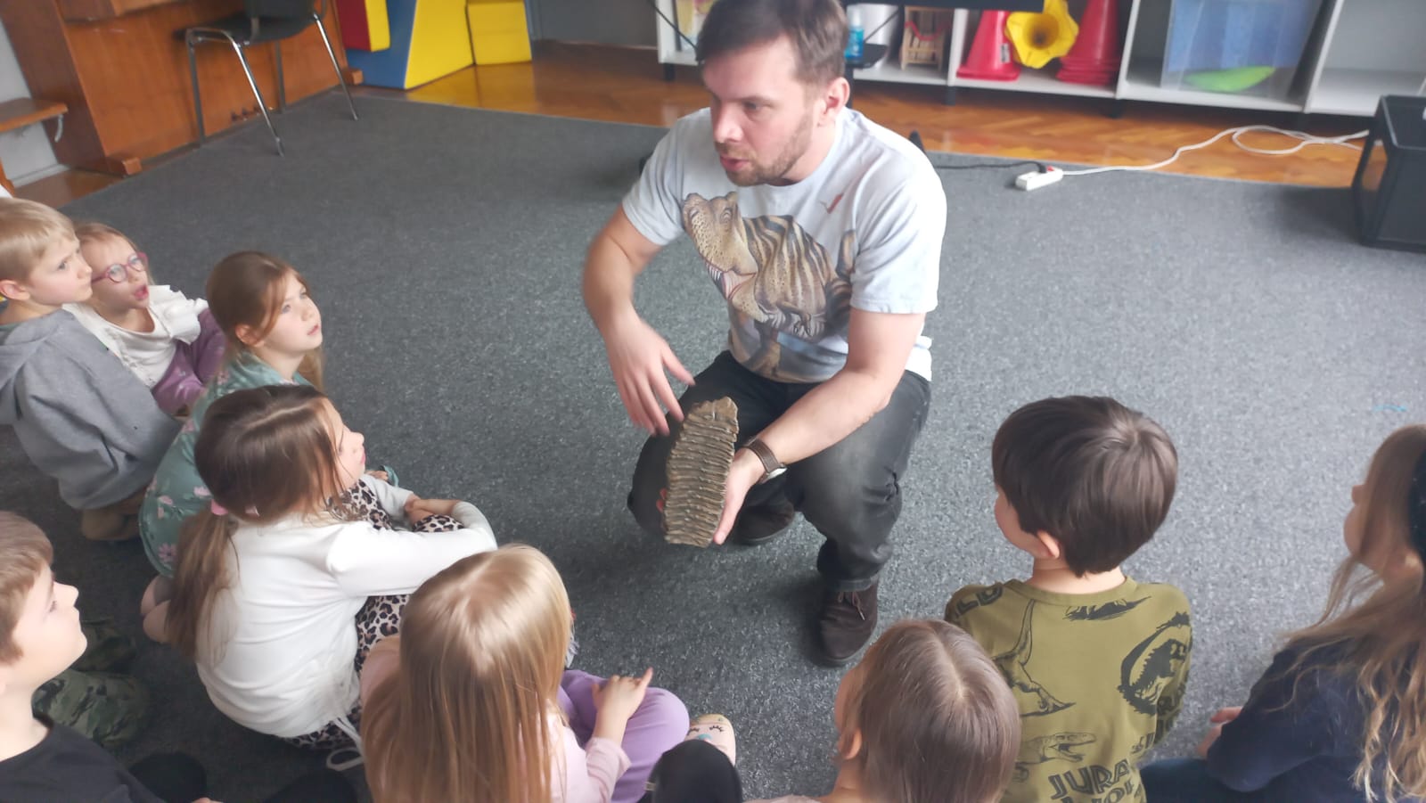 23.02. w naszym przedszkolu gościliśmy paleontologa, który zabrał dzieci w fascynującą podróż do prehistorycznego świata dinozaurów. Przedszkolaki dowiedziały się, kim jest paleontolog, jak powstają skamieniałości oraz jak wygląda praca przy wykopaliskach. Najwięcej radości sprawiła możliwość obejrzenia z bliska „kości dinozaurów”. To było niezwykle ciekawe i pełne emocji spotkanie!